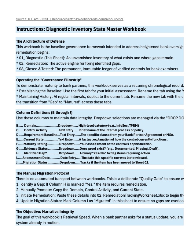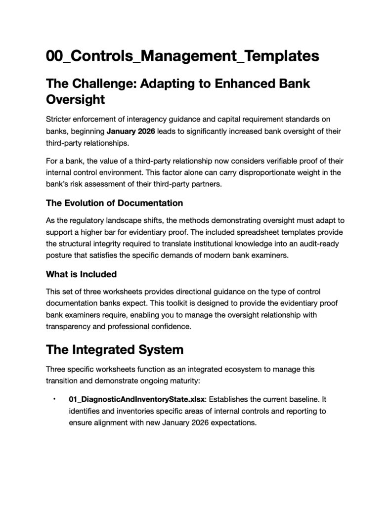 The Spreadsheets are editable and include editable drop downs, and conditional highlighting to draw attention to items. These templates are designed to support the development, and management of an in-house, hybrid or outsourced process that meets the needs of our business partners who are required to manage Third Party Oversight under the Interagency Guidance on Thord Party Relationships issued in June 2023. The materials are intended for internal use to align operational practice with existing accounting policies and oversight expectations.